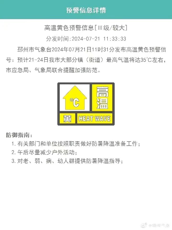今天11时31分邳州市气象台发布 高温黄色预警信号[III级/较大]
